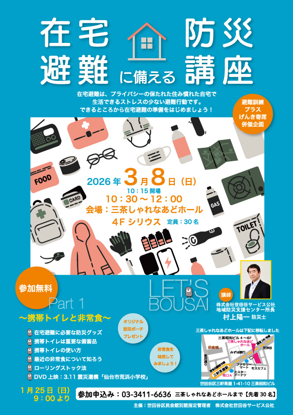 『応援を続けよう!3.11避難訓練プラスげんき寄席』の防災講座として、今年は「在宅避難に備える防災講座」を併催します!