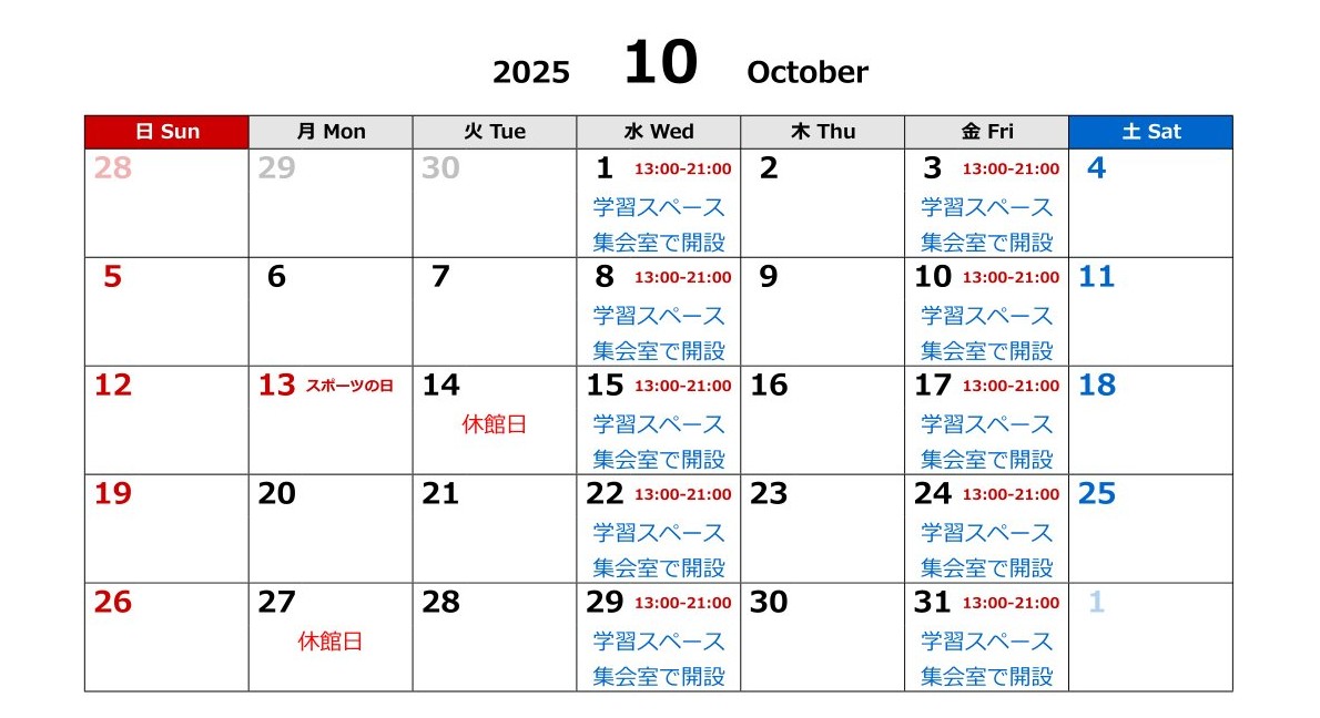 10月は以下の日程で学習スペースを開催しますので、ぜひご利用ください。