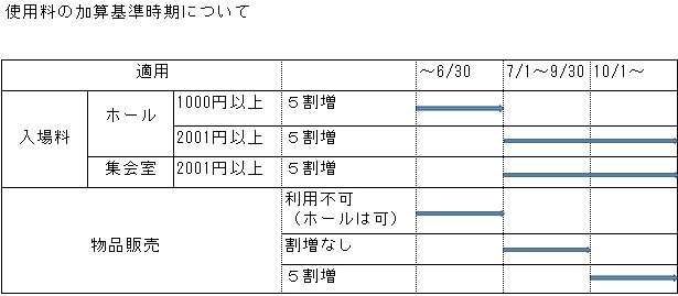 ※ホールについては、従前は「入場料等の金額が1,000円以上」で5割に相当する額を加算していましたが、2026年7月1日の施設利用分から今回の改定に合わせ「2,001円以上」が加算の対象となります。また、2026年10月1日の施設利用分から、催し物に関連する物品販売を行う場合、5割に相当する額が加算されます。