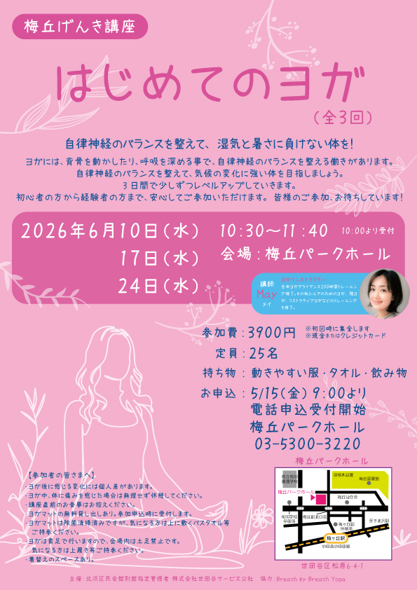 ・ヨガマットの無料貸し出しあり。参加申し込み時に受付します。