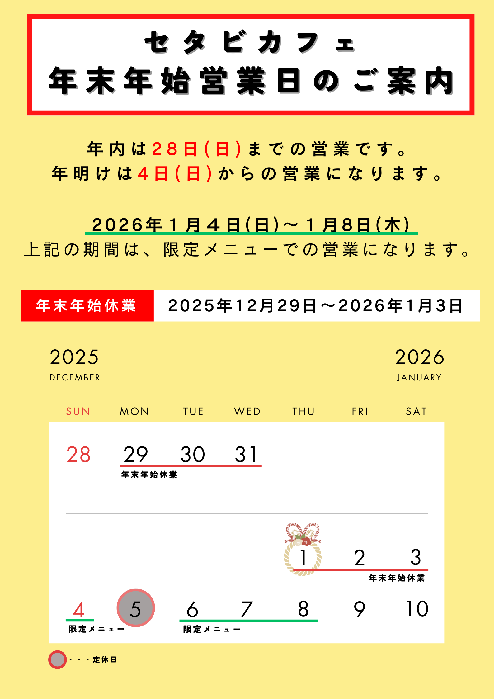 2026年1月4日(日)~1月8日(木) 限定メニューで営業 ※1月5日(月)は定休日